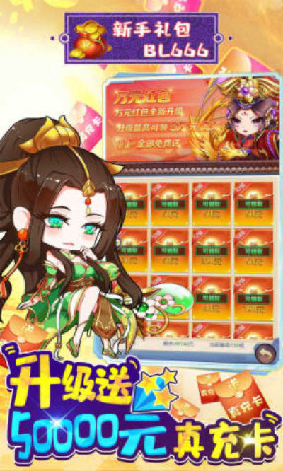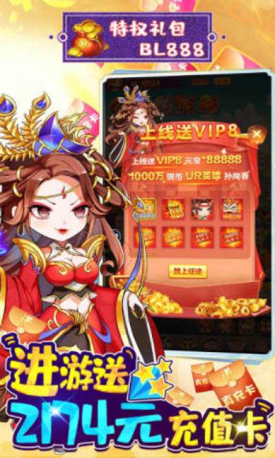 游戏上线赠送VIP8,元宝88888,铜币*1000W,2174元充值卡,UR英雄:孙尚香.
