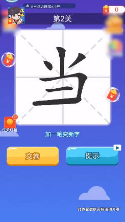 汉字达人秀赚钱版是一款猜汉字的赚钱游戏,游戏玩法非常简单,玩家需要将完整的字加一笔来变成正常的汉字即可获得红包奖励!轻松赚取每日零花钱,感兴趣的朋友不妨来点击下载吧!