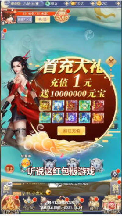 全民修仙红包版游戏是一款登录就能领红包的仙侠手游,趣味修仙玩法,每天都有精彩红包奖励,人气超旺,玩家超多!装备可以自由交易买卖,每天还能固定领取非绑定元宝,各种福利礼包天天免费送,休闲好玩不氪金,真实修仙乐趣,就等你来体验!
