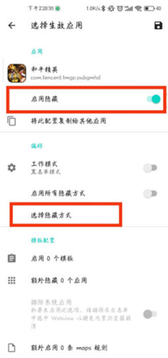 3.隐藏应用列表 - 模板管理 - 创建黑名单模板 - 隐藏0个应用 - 编辑列表 - 全选列表中的应用 - 返回上一级 - 自定义模板名称(为方便描述,以下将对您的模板称为“模板1”) - 保存 - 返回上一级 - 选择生效应用 - 《某个软件》- 启用隐藏(开启) - 工作模式(关闭,即黑名单模式) - 启动所有隐藏方式(关闭) - 选择隐藏方式 - API requests(选中) - Internet queries(选中) - ID detections(选中) - 确定 - 启用0个模板 - 模板1(选中) - 确定 - 保存