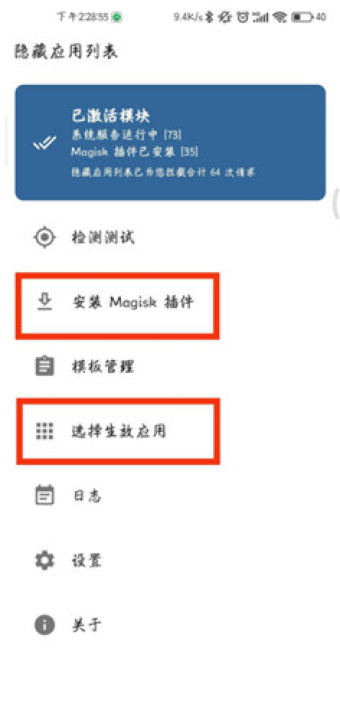 - 隐藏应用为 xp magisk 模块 需要root权限的软件全部勾选。