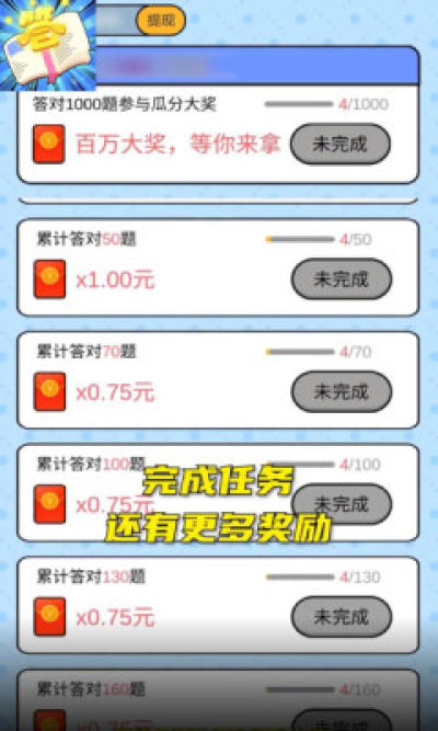 1、全新闯关,这里会有不同的闯关问题,每一次闯关之后就可以获得金币和红包的奖励领取;