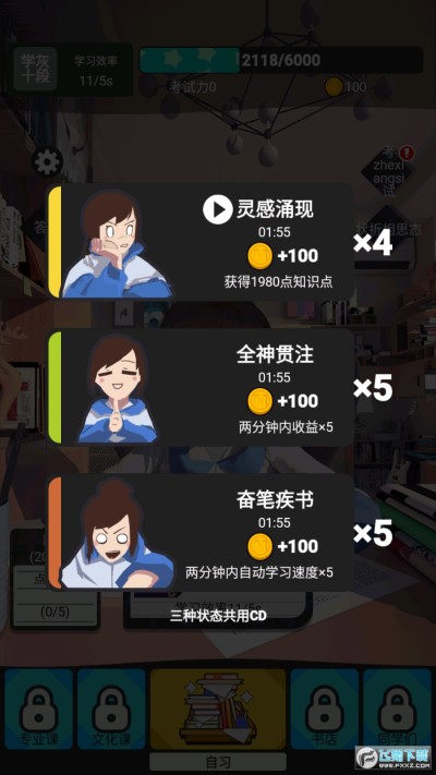 而专业课就不一般了,待达成解锁条件后,点击就能自动产生知识点,并且不同的专业课都有时间刻度,越往后,能力提升的越快。书店功能相对来说就简单了许多,在冷却时间内购买书本,可直接领取大量知识点,而且还是免费的哦。