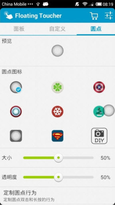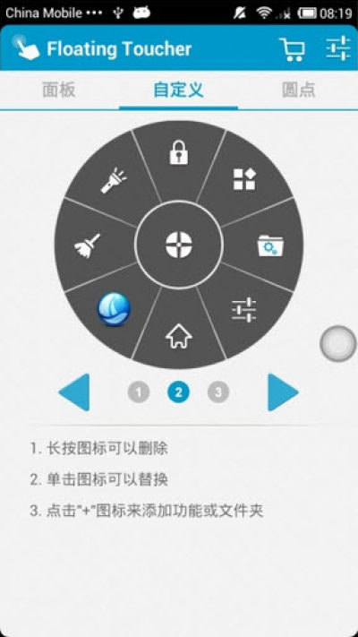 * 可以自定义触控面板每个按钮的启动项,目前可以定义的启动项有增大音量、减小音量、锁定屏幕、主屏幕、清理内存、菜单、返回、近期任务、手电筒、亮度、旋转屏幕、蓝牙、接入点、Wi-Fi、GPS、铃声模式、飞行模式、自定义悬浮触控面板,非常丰富;