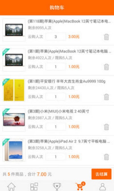 通过在线支付平台,支付1元即购买1人次,获得1个“云购码”。同一件商品可购买多次或一次购买多份,购买的“云购码”越多,获得商品的几率越大。