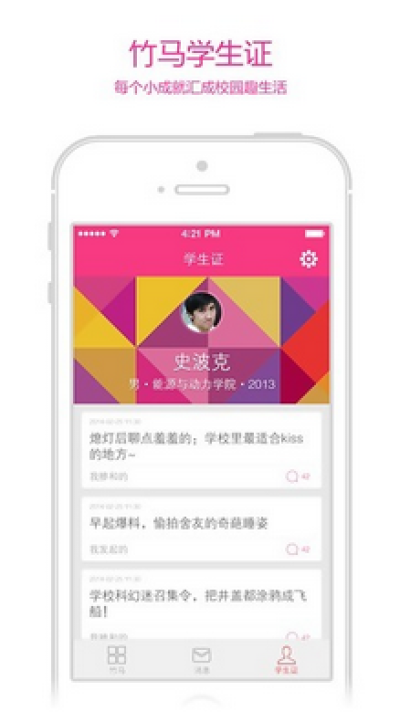 竹马是一款校园社交聊天类的软件,这里汇聚了学校里各种有趣的小活动,你可以与你的小伙伴们线上线下一起玩耍,同时竹马还提供了成绩查询,高考录取查询,图书馆查询等方便的工具!