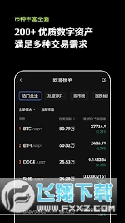 OKx是数字资产交易软件app平台,2017年5月成立,主要面向全球用户提供比特币、莱特币、以太币等数字资产的现货和衍生品交易服务,拥有千万级用户体量,覆盖全球超过200个国家和地区。2265OKEx通过手机端、PC端、Web端等多终端为用户提供安全、稳定、可信的数字资产交易服务,采用GSLB、分布式服务器集群、分布式存储、多机互备的高速内存交易引擎、冷钱包、私钥离线化的热钱包等技术,保障用户资产安全和交易体验。OKEx打造的去中心化公链OKChain,其目标是推动区块链技术商业应用的大规模落地,可支持各类去中心化应用,允许用户基于OKChain发行自己的数字资产、创建自己的数字资产交易对,进行自由交易。