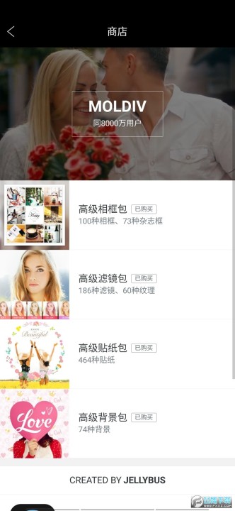 2.最新版本的MOLDIV中有数百种图章和文本功能,应用它们可以使照片精美显示。