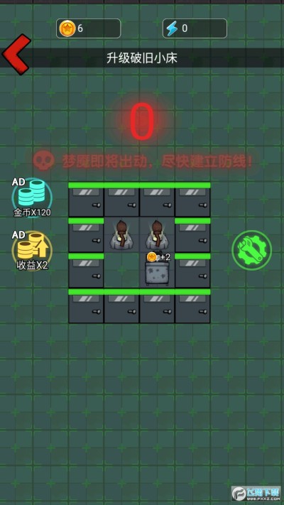 玩家们需要在自己入场之后到倒计时结束之前进入到宿舍内不断的躺下睡觉,并不断一步步的开始塔防,游戏内的许多玩法都很新颖,你可以在线安排好自己手中的道具进行塔防上的升级哦!游戏很多的时候不仅仅是需要靠自己,很多的时候还是要看队友,有时候还是要一定运气的哦!