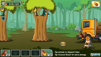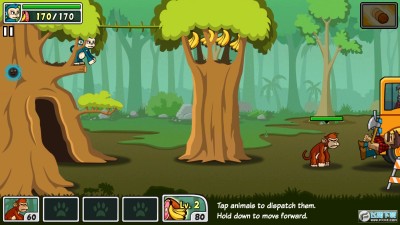 2、本作共有 66 道关卡之多,初期游戏会让玩家先学习一些玩法技巧,通过点击左右半屏来让猴子在几颗大树之间移动并拾取香蕉,而这些香蕉就是出兵所需要消耗的资源。和一些对推塔防游戏不同,这里并没有人口限制一说,只要香蕉足够,待各个动物的 CD 冷却之后,想出多少都行,当然这也是因为公益作品的缘故,难度的设定上不会过份为难大家。