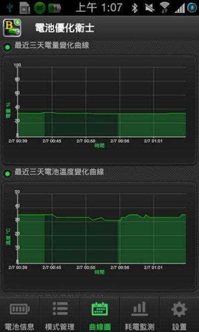 电池优化卫士以曲线图形式记录最近三天的电池电量变化、温度变化以及电压变化走势。 你还可以通过这些资料找出最适合自己的省电模式。