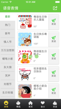 腾牛微助手语音表情栏目是APP的主打特色之一,涵盖了最新、最热门的搞笑语音表情,即将到来的劳动节表情,刚刚过去的情人节和春节主题表情,还有汇集网络的万万没想到、蜡笔小新、暴走漫画、灰太狼表情,让你瞬间变身表情帝。