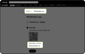打开官网,在安全中心,绑定身份验证器 App 页面,复制密钥。