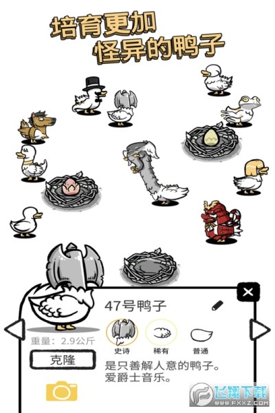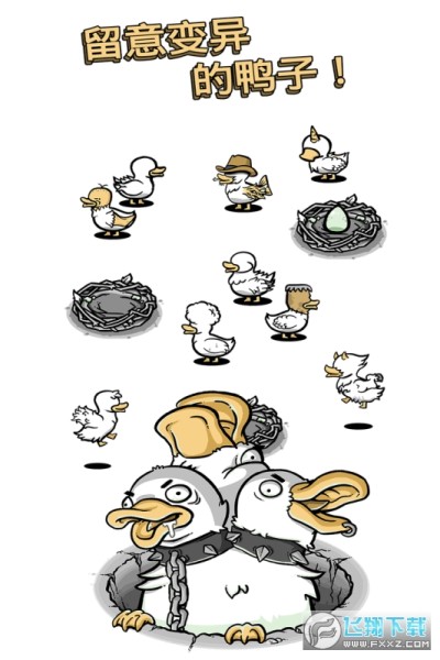 怪鸭世界是一款鸭子养成手游,游戏的玩法十分独特新颖,你将不断的养殖鸭子,下蛋,孵化鸭蛋,然后重复。直到某一个鸭子的基因变种,变种的鸭子会长得奇形怪状,非常的有趣,还有许多独特的内容等待你来发掘,快来试试吧。