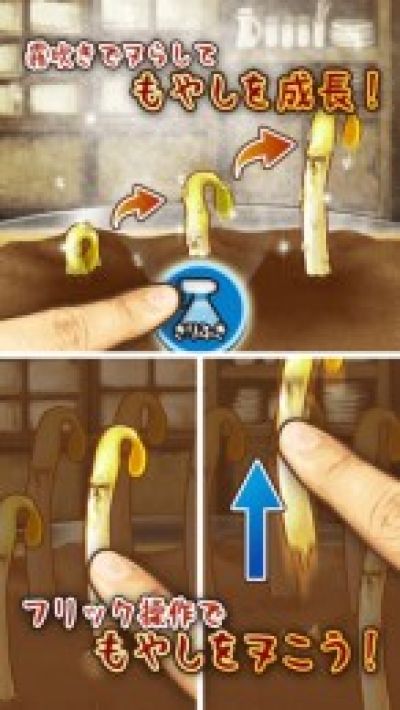 每个豆芽开始不太值钱,收货一根才1日元(有脸的豆芽谁要啊!),不过积小成多,多点浇水让它们长快一点吧!收获一定数量的时候会出现 FEVER 模式,这时豆芽可以不需等待就会成熟,这是赚钱的好时机!使出你浑身力气的一阳指(= =)把豆芽们都抽出来吧!每种豆芽收获一定数量就能达到升级的要求,这时可以用钱去帮我们帅气逼人的人脸豆芽升级,每升级一次收获时获得的钱就会越多。