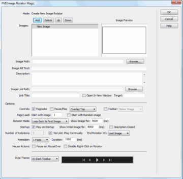 图像旋转魔术是一个强大的,功能丰富的Dreamweaver扩展,使您可以即时创建与效率在网页上管理一个或多个图像/横幅旋转器基于标准的CSS和标记-和未经Flash的开销或开放的困难源脚本库。
