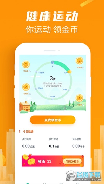 2、在app界面中可直观查看统计的当日运动数据,还能进行运动兑金币;