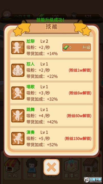3.加入了有趣的技能系统:玩家可以解锁和升级不同的技能,在直播中使用技能可增加带货销量和吸引粉丝!