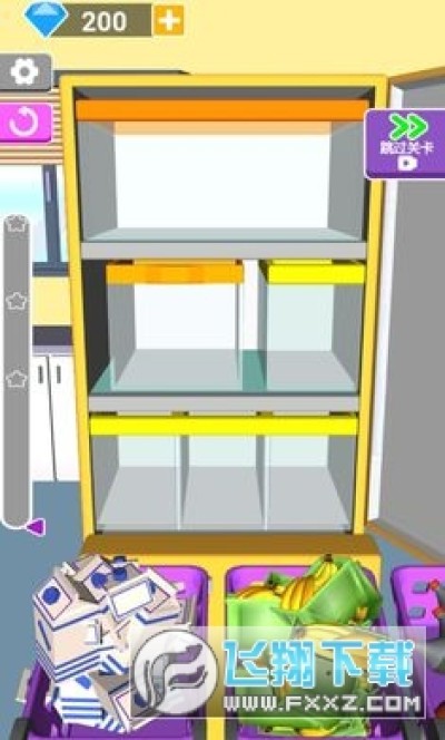 2、游戏中,需要将篮筐内五花八门的用品,全部收纳进冰箱,将冰箱装的满满的,整整齐齐排排坐。