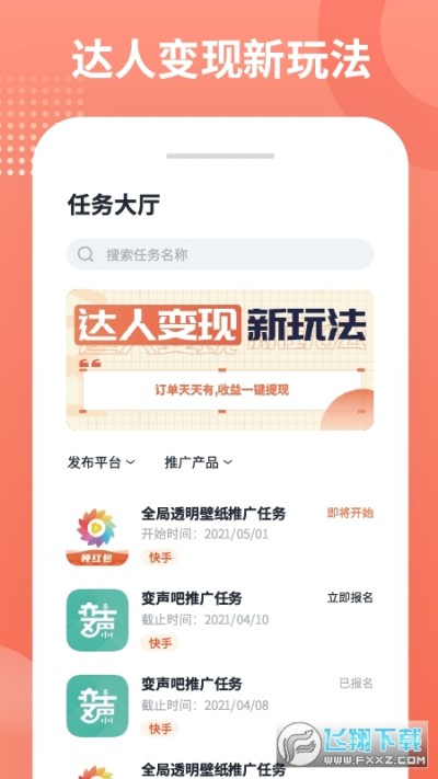 任务大厅:每日提供不一样的的任务,协助达人在短视频平台上发布自己的作品。