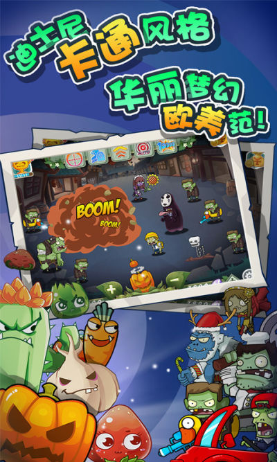 精致的萌系画风当道,数十种可爱萌僵尸BOSS和超另类植物武器,萌到没朋友,为您打造一种轻松惬意的基调;开着跑车的BOSS僵尸缓缓悠悠,背着“行囊”的神偷僵尸箭步如飞,还有已故的爱因斯坦僵尸,还能呼叫空袭;切换您手中的植物武器,大蒜植物,草莓植物,仙人掌植物,萝卜植物,西瓜植物,更有究极南瓜植物;给予他们致命一击,赚个盆丰钵满,快乐收益根本停不下来