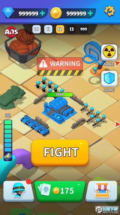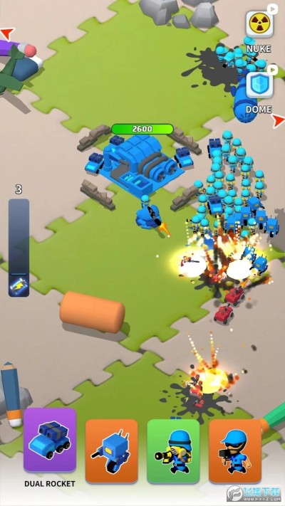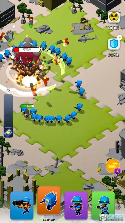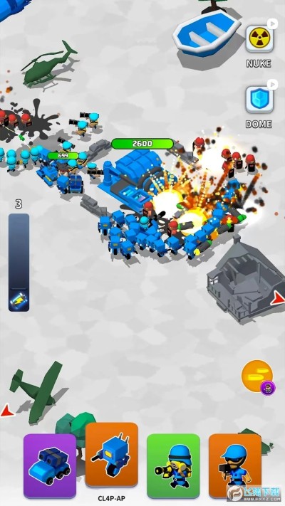 从基本的武器装备开始,然后通过游戏中一次次的胜利来赚取金币和升级战斗力。你还可以购买卡片以获得不同军种!火箭炮、喷火兵、装甲车、坦克都在等你来指挥!