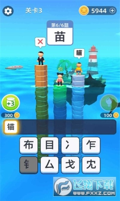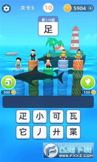 汉字向上跳是一款十分考验大家脑和手的游戏,需要在时限内快速的组成目标汉字,不然就会掉到水中被鲨鱼吃掉,通过你的努力,可以让游戏中的角色跳跃的更高。有兴趣的玩家快来下载玩玩吧。