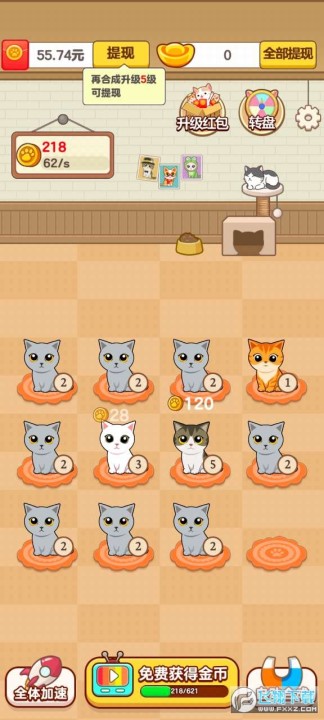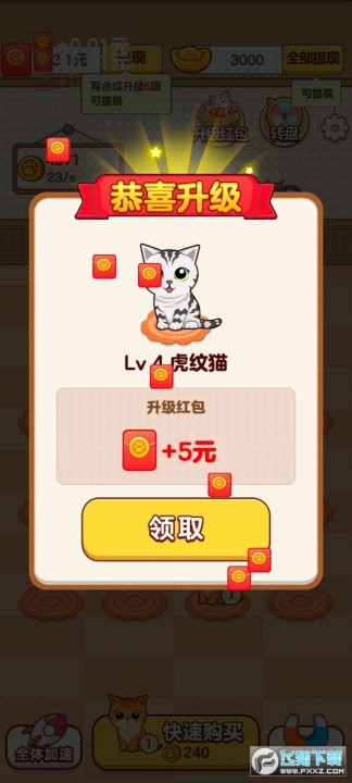 招财舍是一款休闲合成类小游戏放置挂机的轻松玩法,开一家猫舍,不断合成升级新的小猫为猫舍带来收益,每合成一个新的级别小猫都会获得红包奖励,无门槛提现秒到账,感兴趣的小伙伴们快来下载游戏试试吧!