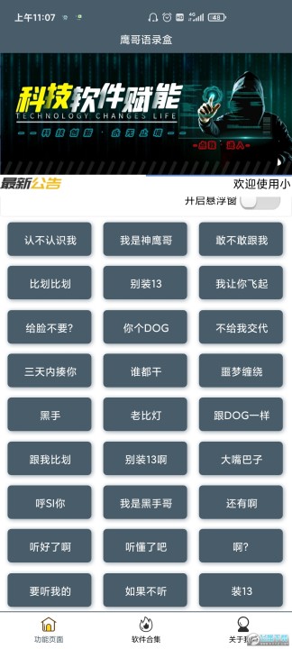 鹰哥语录盒app最新版是专为用户提供的一个整蛊搞怪语音盒子软件,在这里神鹰哥经典语音可以自由组合,除此之外本次软件提供了很多其它软件分享,感兴趣的小伙伴可以下载试试看!
