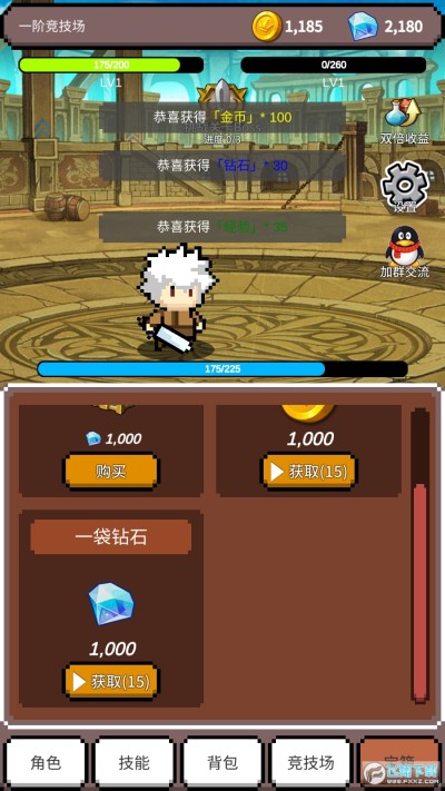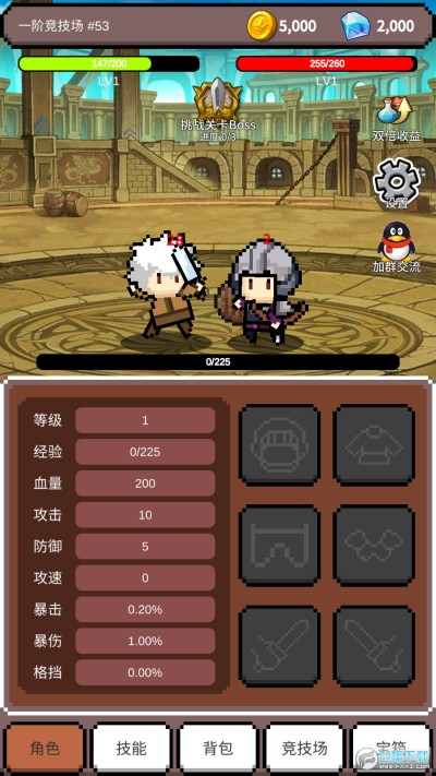 然后,角色属性提升上来后可以挑战每阶竞技场的Boss了,只有打败每阶竞技场的Boss才可以前往下一阶竞技场哦,技能也会被锁住上限。要是打不过,也不要紧,通过离线获取金币、钻石、经验来提升角色属性。让子弹飞一会~