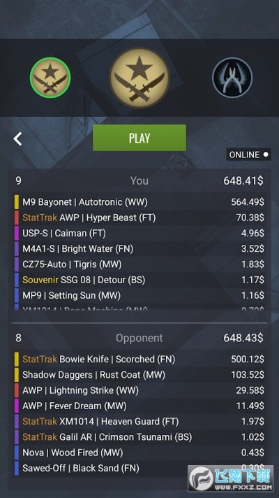 市场-购买所需品质的任何武器或刀!您可以使用按名称搜索皮肤或在五个武器类别中浏览皮肤。当心:市场上的商品要贵50%,所以在购买前要明智地选择!