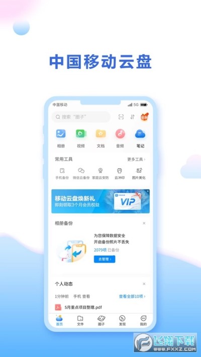 中国移动云盘(原名“和彩云网盘”)是中国移动重磅推出的安全+智能+不限速+移动用户免流的网盘,为用户提供微信文件、手机图片、通讯录等数字资产的存储备份、多端同步、在线管理、群组共享等服务,致力于成为5G时代用户个人与家庭的数字资产管理中心。现有“新人领取1T/年个人云空间”、“签到送积分兑好礼”等火爆活动,而且移动用户可0元领30G中国移动云盘定向流量,享上传下载备份免流量等超级福利。