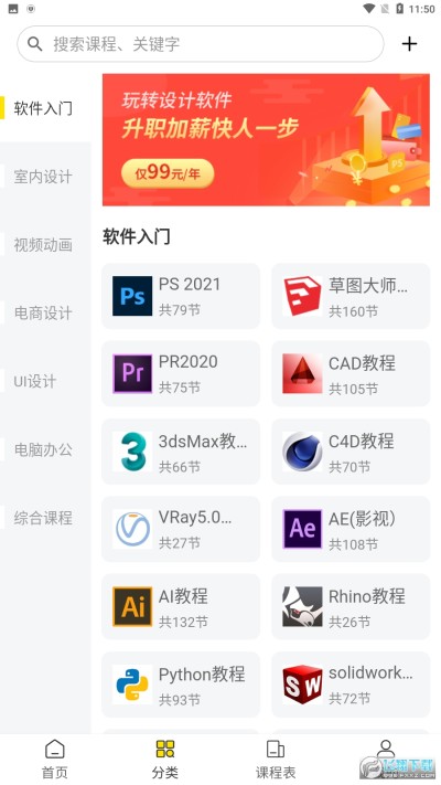 2、包含电商、平面、室内等多种设计课程,用户可以在羽兔网免费提升设计能力。