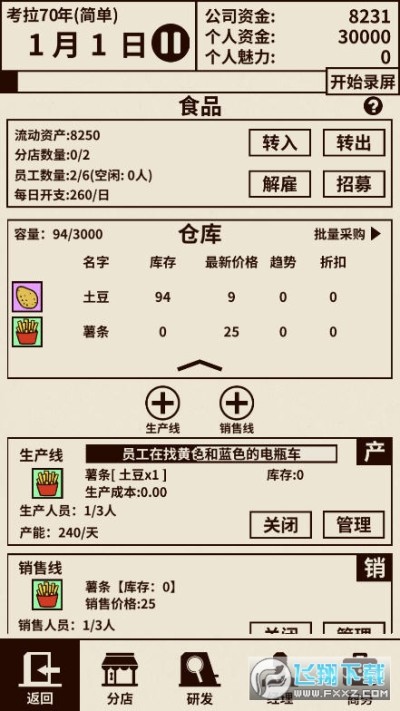 随着研究开发,公司的产品也越来越丰富,从简单的薯条面包,到价值千金的豪车。你天生的经商头脑带着公司逐步进入轨道。