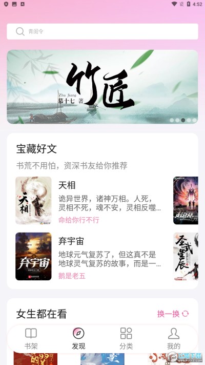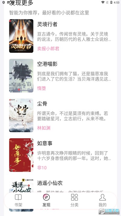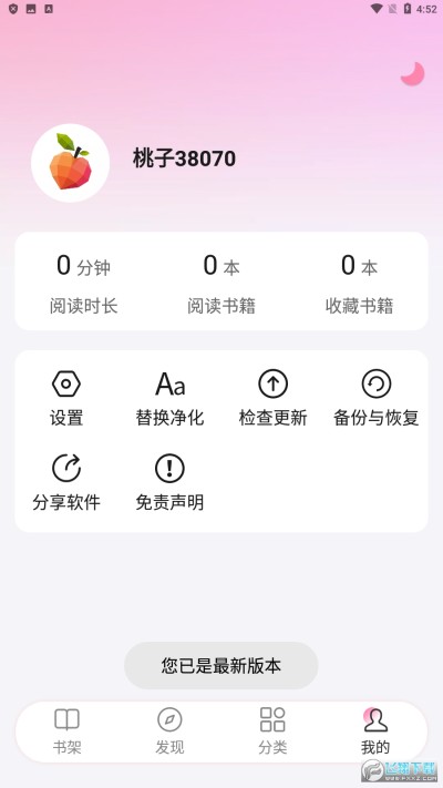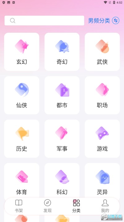 主要界面设计是以粉+白的配色为主,新颖清晰。书架设计良心实用,近期阅读的书籍着重体现,分类界面明确,选择多,根据喜欢看的类型选择小说,书荒一去不复返!