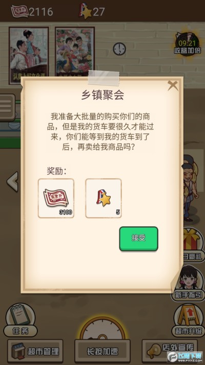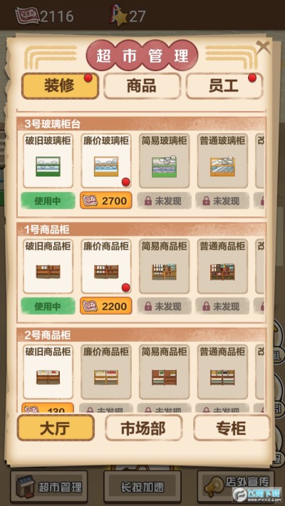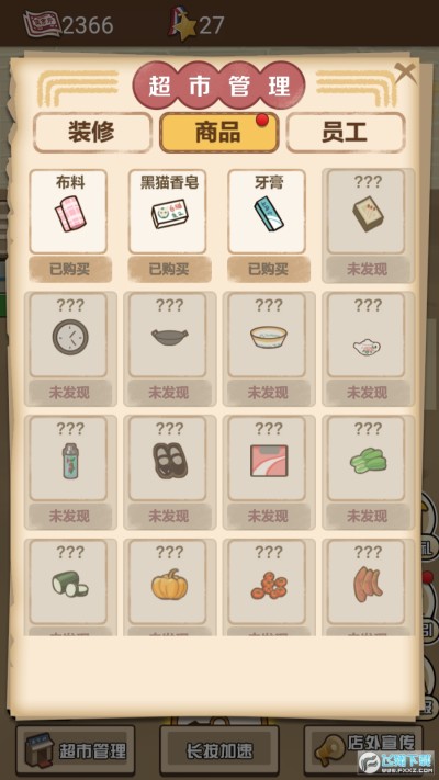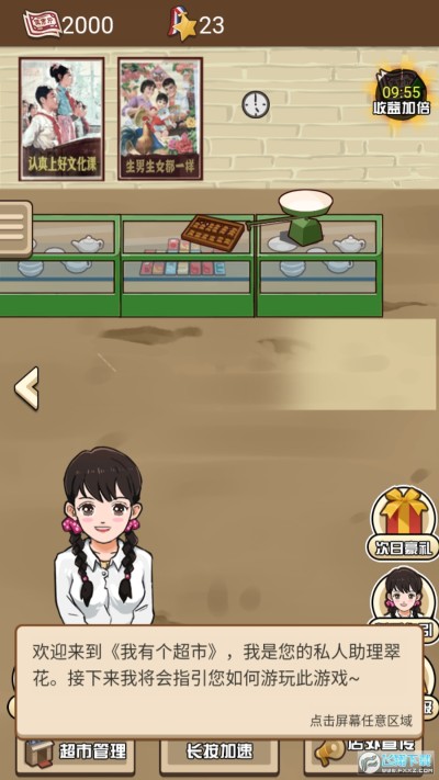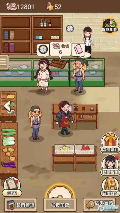 游戏开始只是开了一间小卖部。随着玩家一步步的细心经营,小卖部将变得越来越高级,成长为现代商超!