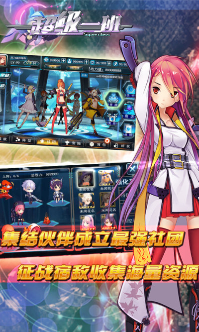 超级一班是一款各种次元穿越乱入娘化的角色扮演游戏,游戏者玩家会看到来自各次元的可爱萌娘穿越而至,齐聚超级一班,你可以和她们并肩作战,开一个大大的水晶宫,还等什么?赶快加入吧。