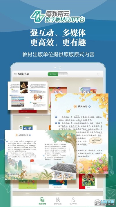 广东省针对全省中小学推出的地数字教材应用平台,提供义务教育阶段国家课程数字教材,汇聚海量、优质、专业的课程核心资源,并对翻转课堂、主题探究、问题解决等新型教学应用模式提供全面支撑。让学习更个性化、更高效、更有趣,让课本炫动起来!