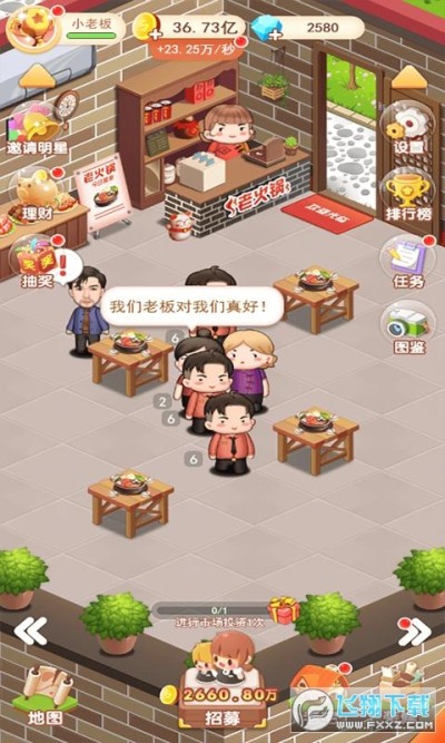 《我要开店暴富》是一款模拟经营类游戏,玩家作为出入社会的打工人,要想获得父亲的财产就必须自己创业成功。 本游戏有奶茶店、火锅店、米粉店、包子铺等10个店铺,需要完成对应任务才会逐渐开放多个店面。 除了日常经营外,每日所得收益还可以购买家具,用来解锁自己的房间以及装饰家园。 家园又分为客厅、卧室、花园、厨房等不同房间,每个房间都可根据自己喜好随心搭配装饰。