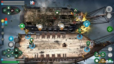 海战主要分为全程攻击阶段和接近登船阶段,如果难度不大,一般远程射击就行,遇到海盗就比较棘手,敌人登船后需要更多的即时操作,利用好暂停功能会事半功倍,注重走位、充分且合理利用一些固定装备将会让战斗的损失减小到最低,这里其实才是游戏最精髓的部分,毕竟游戏的战斗模式继承了欧美传统RPG的模式。