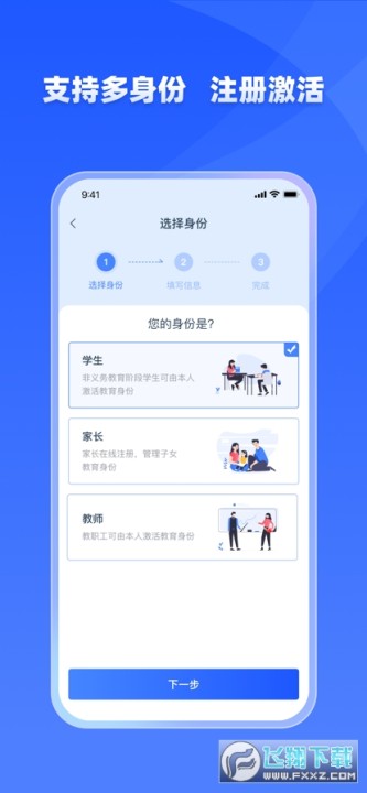 2、在注册过程中,请根据您的实际身份选择相应的登录身份,包括学生、家长或教师,并点击“下一步”以继续。