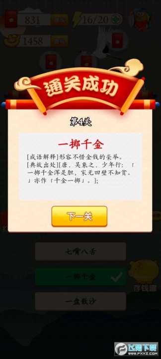 2、闯关答题模式,海量关卡随机出现成千上万的成语,点击屏幕填充成语。