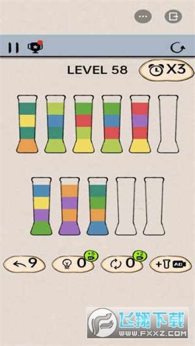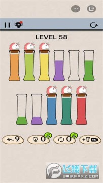 2、每一个关卡都会有着不同的难度,玩家需要吧玻璃杯中不同颜色的液体分配到相同颜色的液体之中去;