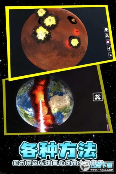 你的任务很简单 - 选择太阳系行星之一并以各种方式摧毁它。将炸弹放在表面上,然后引爆所有炸弹。向地球上的任何位置发射尽可能多的火箭和导弹。使用激光碎片穿过熔岩到达地球的核心。最后,如果整个行星都有巨大的影响呢?你可以自己试一试,选择像火星或水星这样的大行星,直接扔到地球上,或者太阳系中的任何其他行星上。