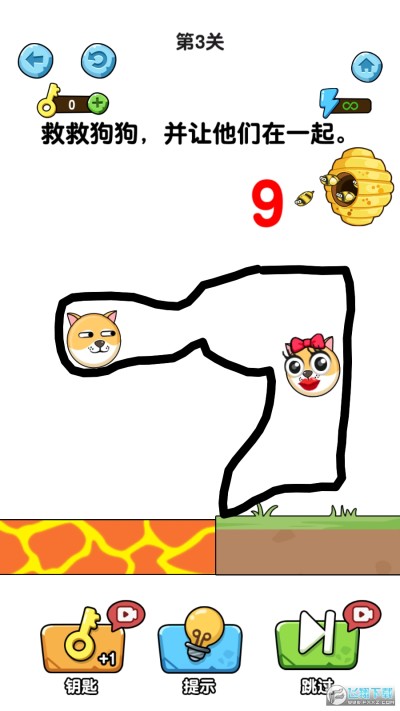 1、这里有可爱的小狗狗等你救援,使用画笔来画线吧,找到正确的救援方法。