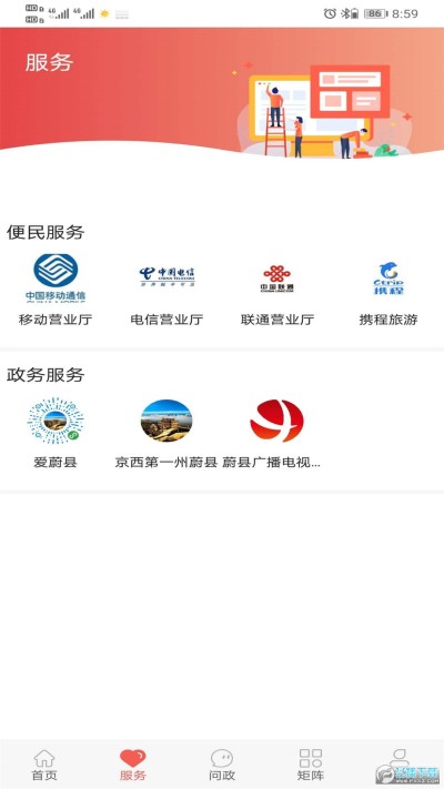 4、在服务页面,选择便民服务或政务服务即可查看推荐的服务项目