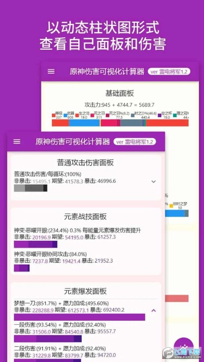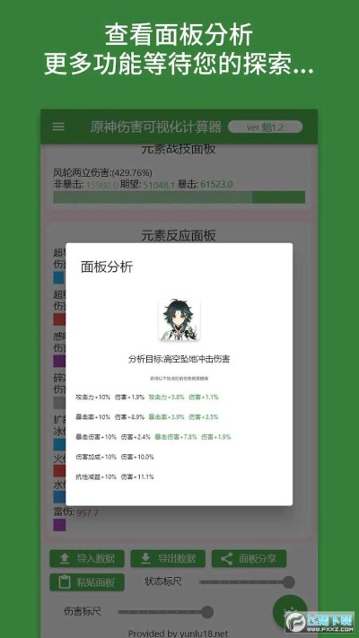 原神伤害可视化计算器是一款旨在将原神游戏中产生的伤害数值和伤害buff进行可视化的工具动态柱状图显示伤害暴击,非暴击,期待值伤害随面板动态变化,一目了然轻松滑动 一键切换滑动和切换按钮来切换人物面板,增益属性支持导入导出可以导入导出自己的面板,以便以后再次查询,也可以把自己面板分享给其他玩家