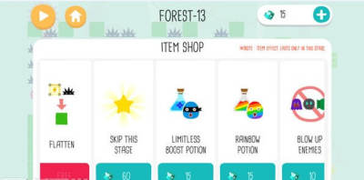 游戏中某些关卡通关后能获得宝石,每天登陆游戏签到也能获得宝石。点击屏幕左上角的购物车就能打开商店,里面有各种道具可供选择,如跳过当前关卡、吹飞全部敌人等,此外还有能让小果冻暂时拥有特殊能力的忍者药水和彩虹药水。如果你喜欢可爱风格的休闲游戏,那么本作应该不会让你失望哦。