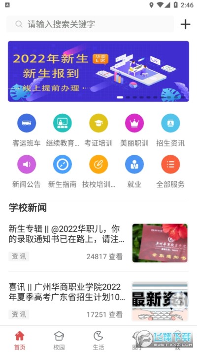 新生入学:入学办理、宿舍分配、华商介绍、美丽华商、在线咨询、交通与周边、校园通讯录等各类服务