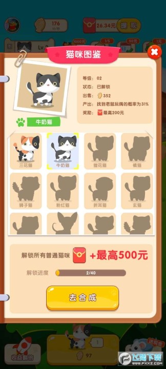 3、超多可爱的猫可以解锁,超过40种不同的猫等你合成解锁,快来挑战吧!